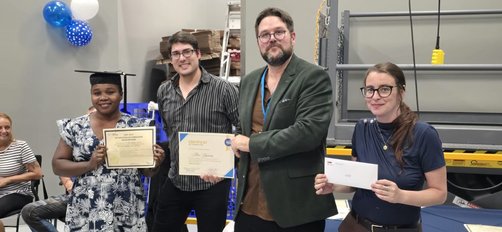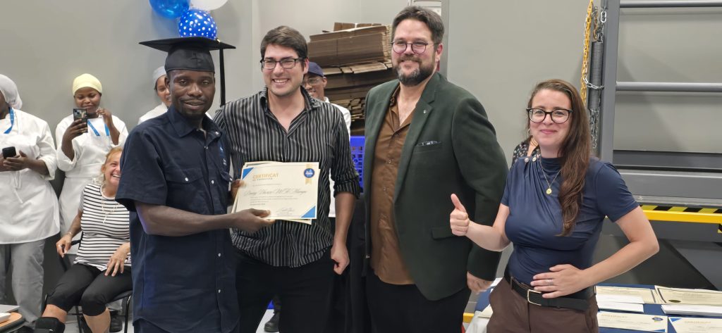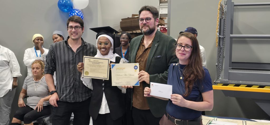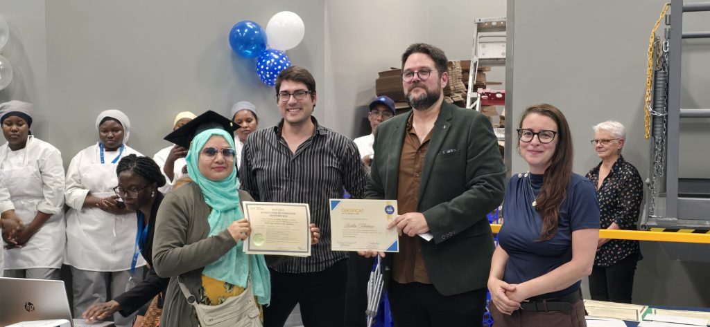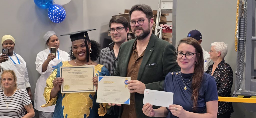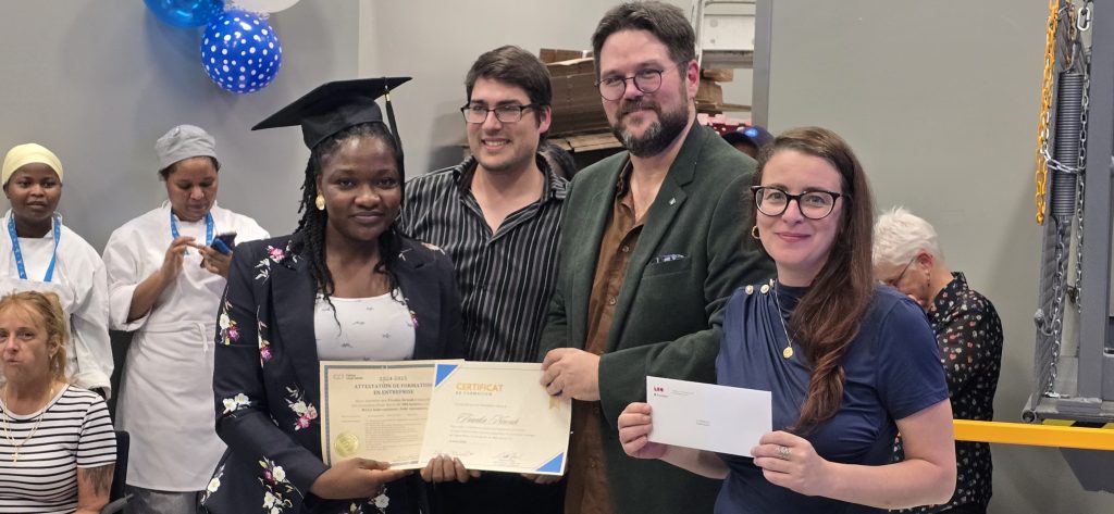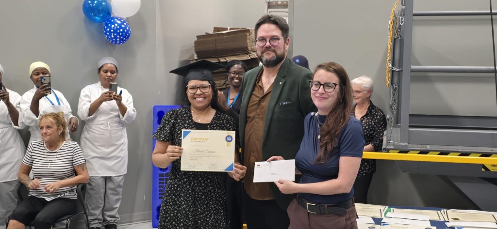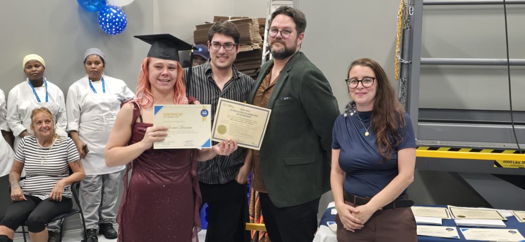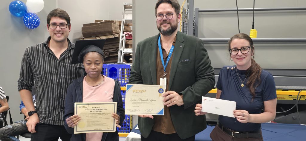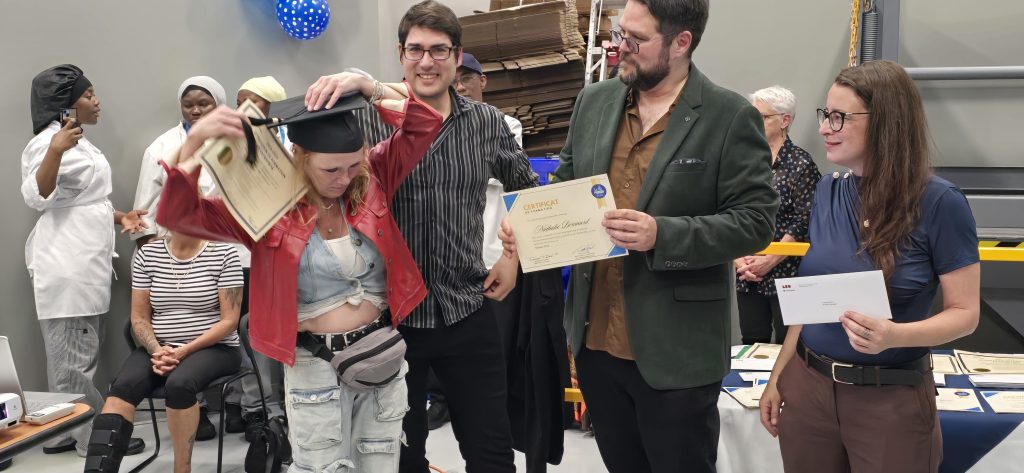 Remise de diplômes – Pignon Bleu Accueil Remise de diplômes - Pignon Bleu FAIRE UN DON 19 juin 2025 Partager Le 19 juin 2025, un évènement de remise des diplômes au Pignon Bleu, organisme communautaire : 19 finissants y ont souligné leur réussite et l’obtention de leur diplôme d’aide-cuisinier. Article précédentArticle suivant